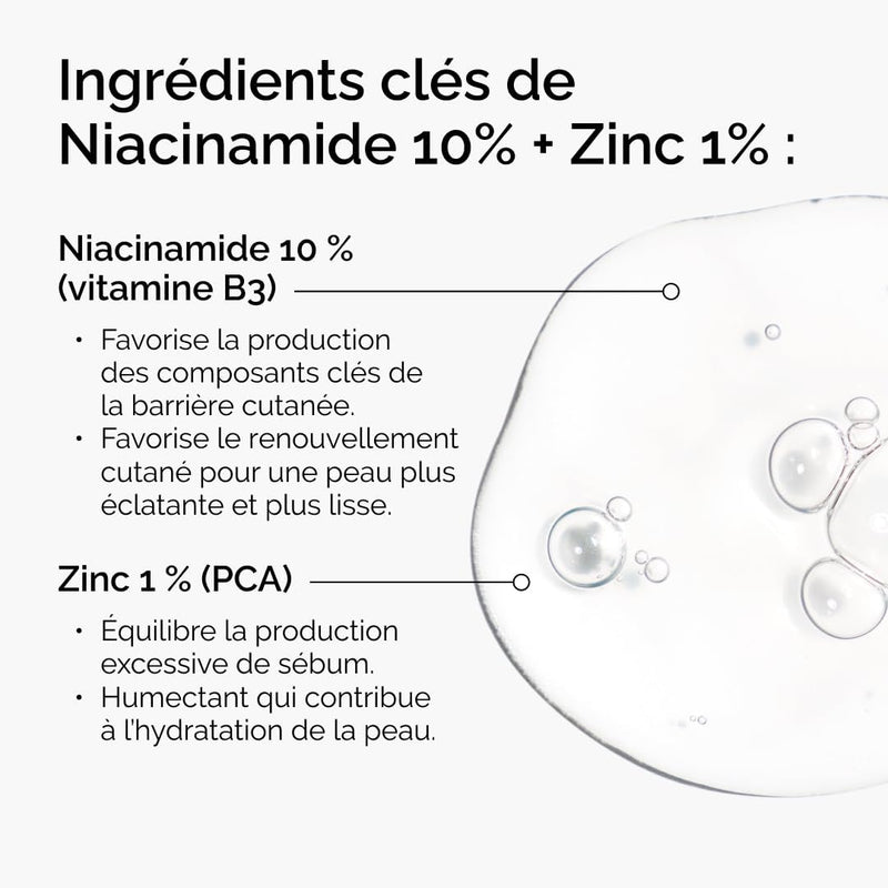 • Niacinamide 10% (Vitamine B3) : Régule sébum, réduit imperfections, unifie teint